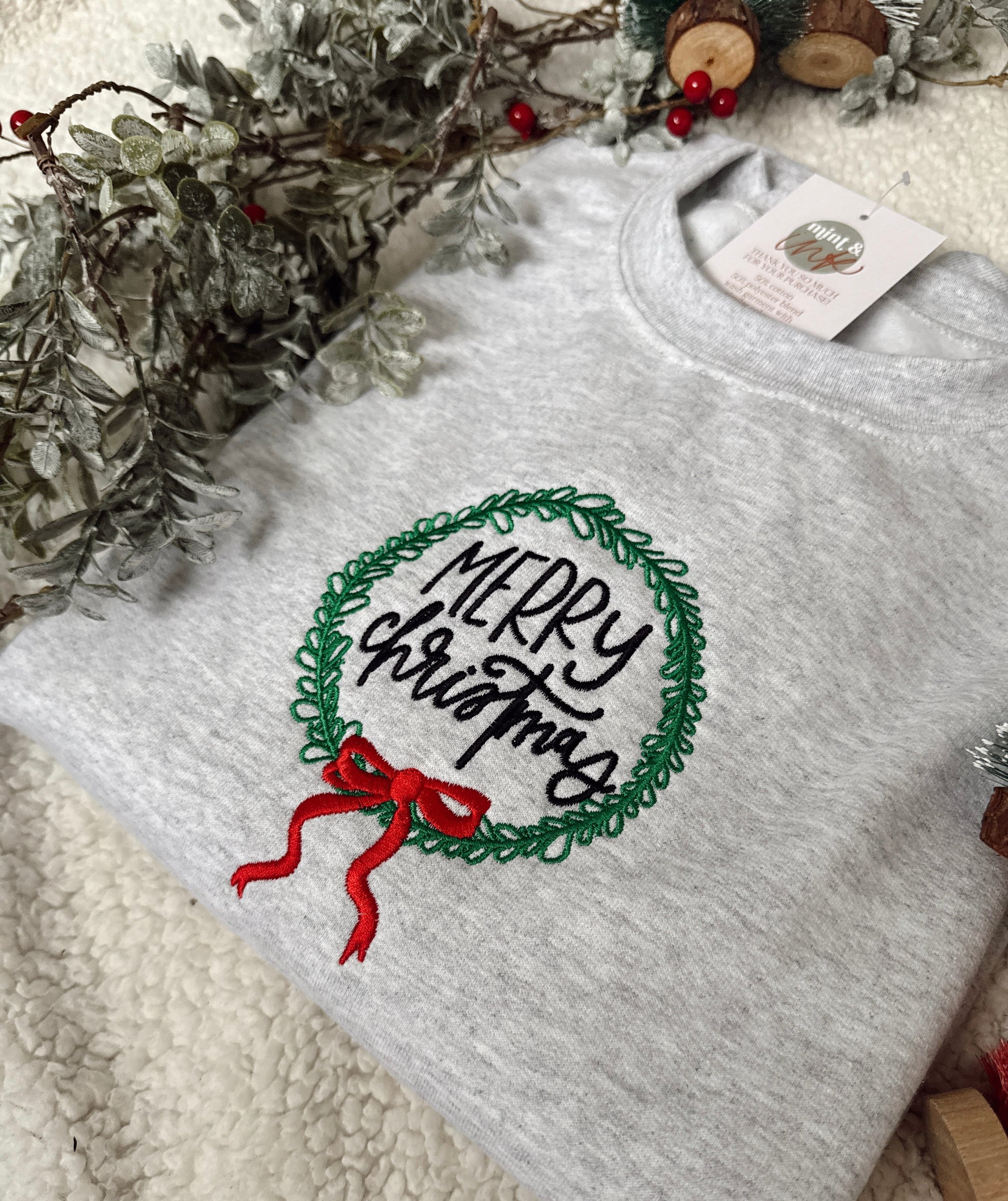 This cozy fleece-lined Christmas jumper features a hand-drawn wreath paired with simple “Merry Christmas” lettering for a soft, charming holiday look. It comes in two different colours, Baby Pink & Ash Gray.